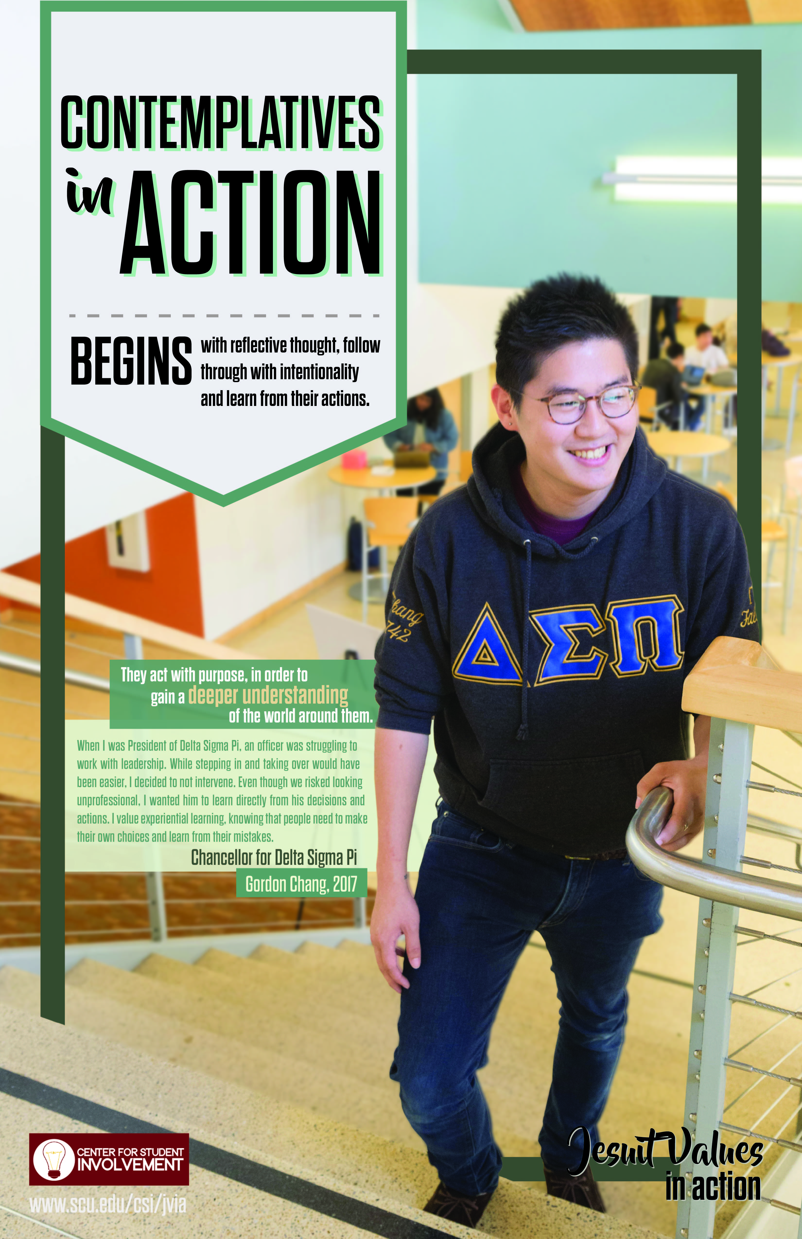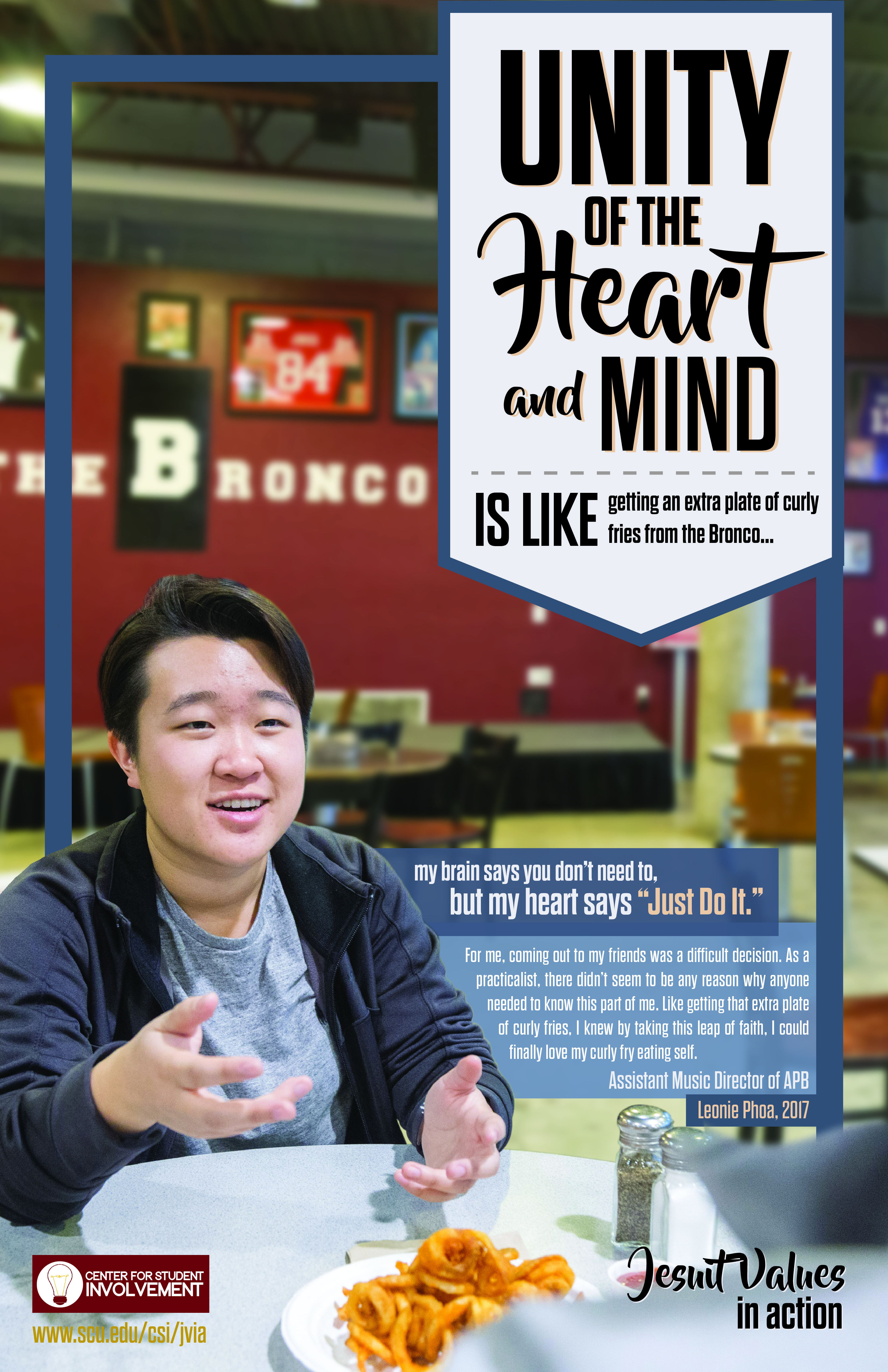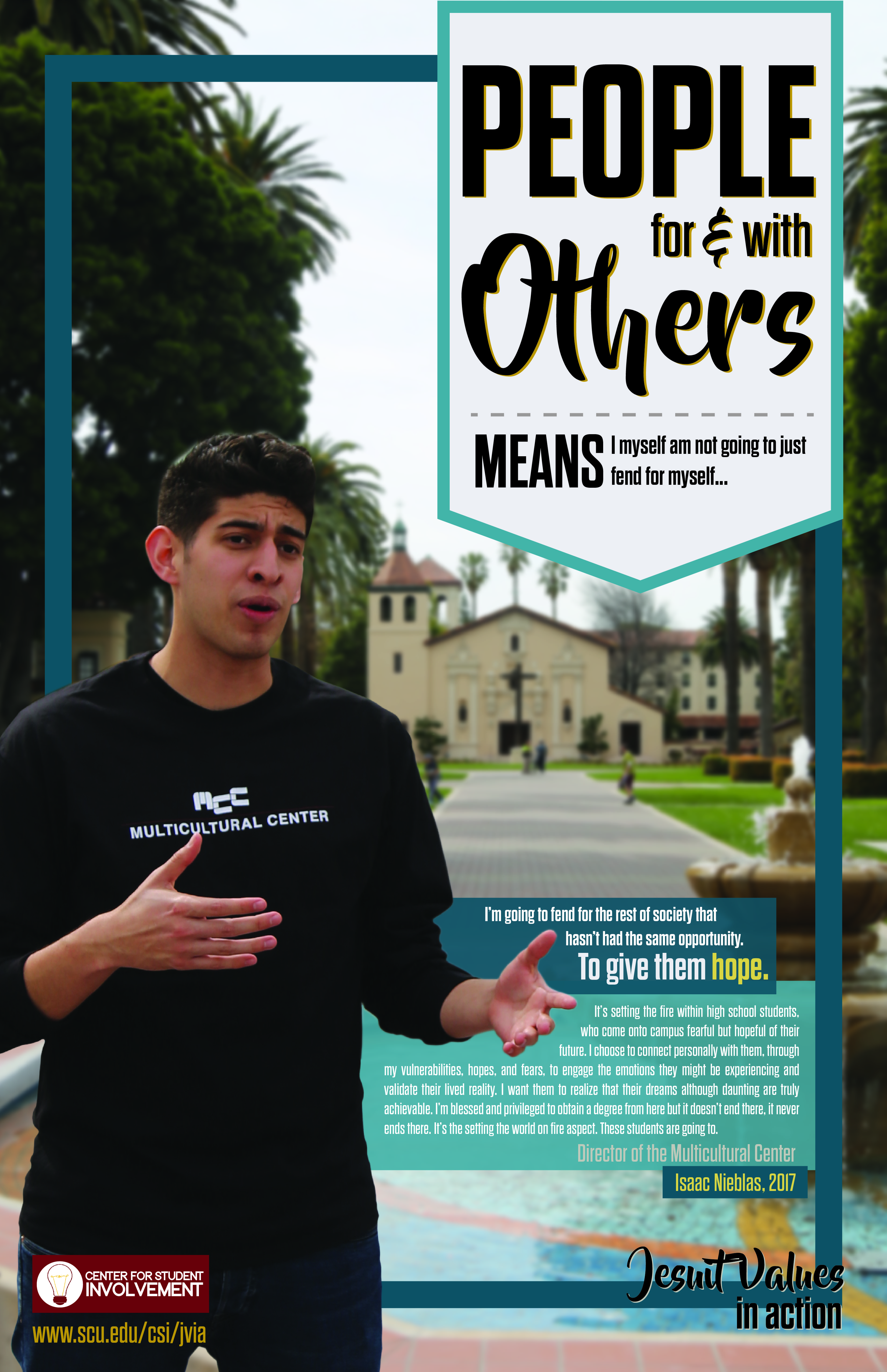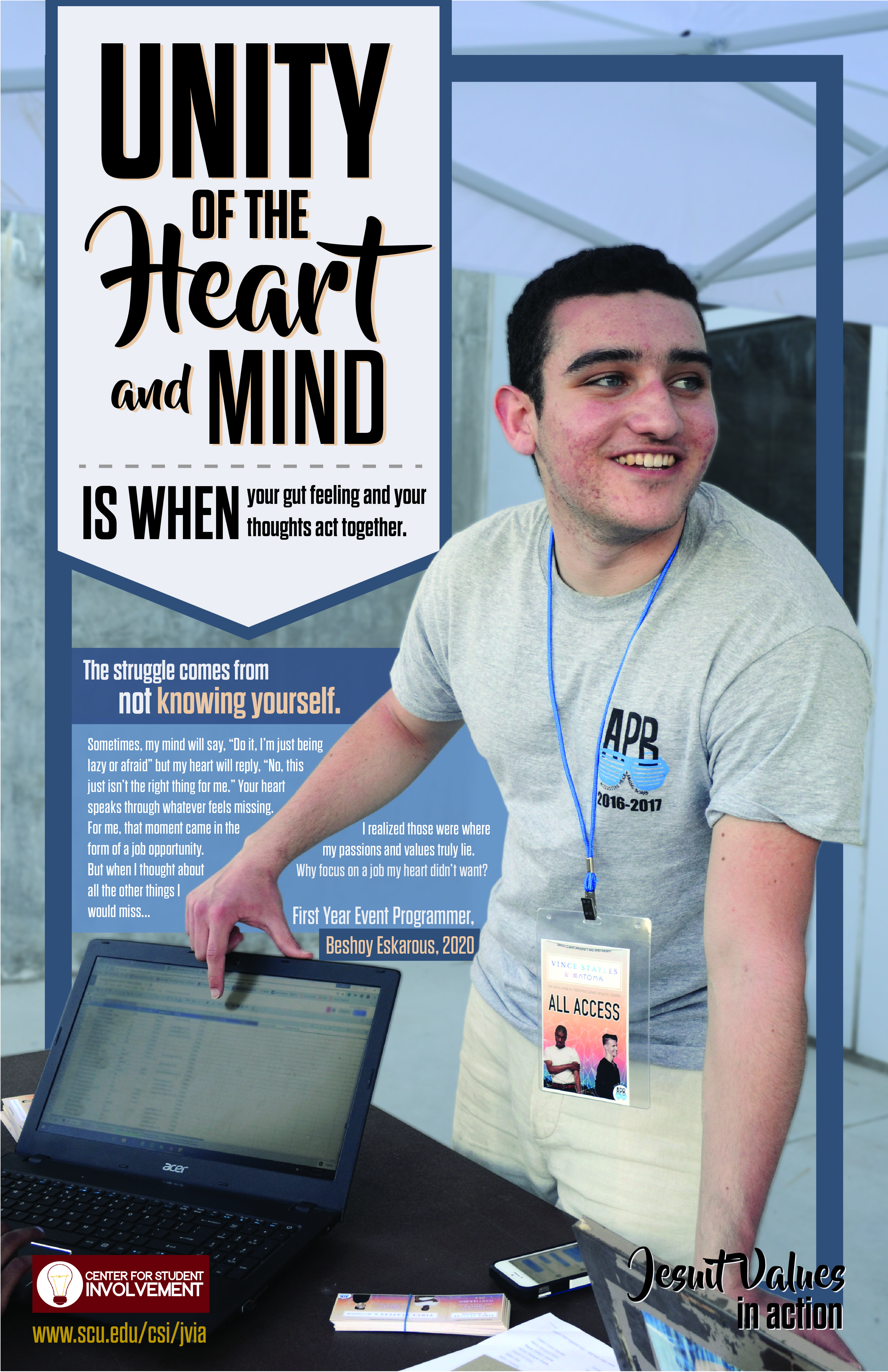 Through the use of these values and how they make a real difference in the lives of students, we hope to engage a larger conversation of Jesuit identity and how students apply them to real life, often including messy situations. We hope for these posters to serve as a snapshot of just a few of the ways these values are alive on our campus.