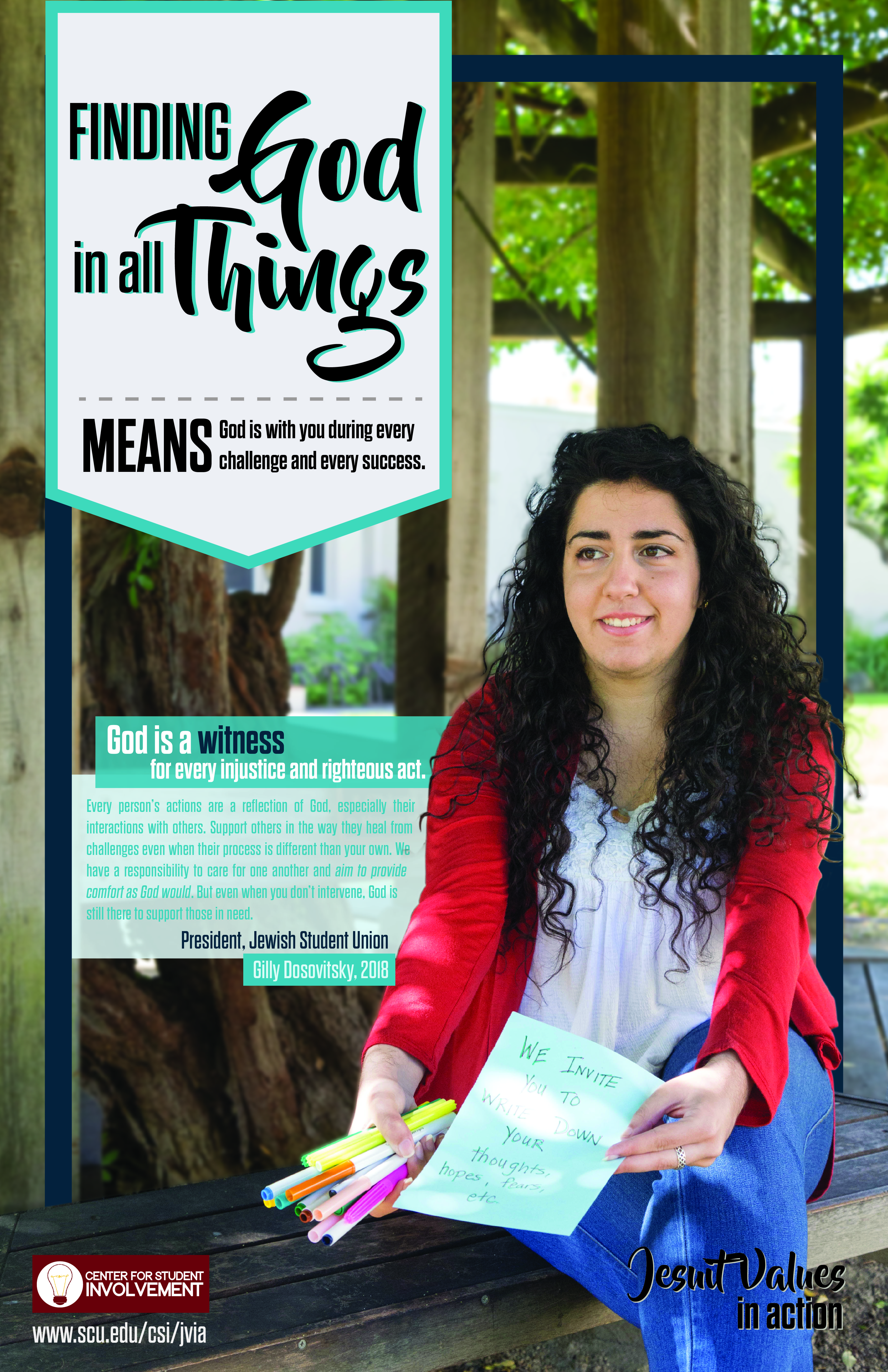- Finding God in All Things: This may be the one phrase that sums up Ignatian Spirituality. It invites a person to search for and find God in every circumstance of life; God is present everywhere and can be found in all of creation. As SCU seeks to be an inclusive campus to people of all faiths and spiritualties, including those who are atheist and agnostic, we encourage students to define who or what God is to them in this value within this project.