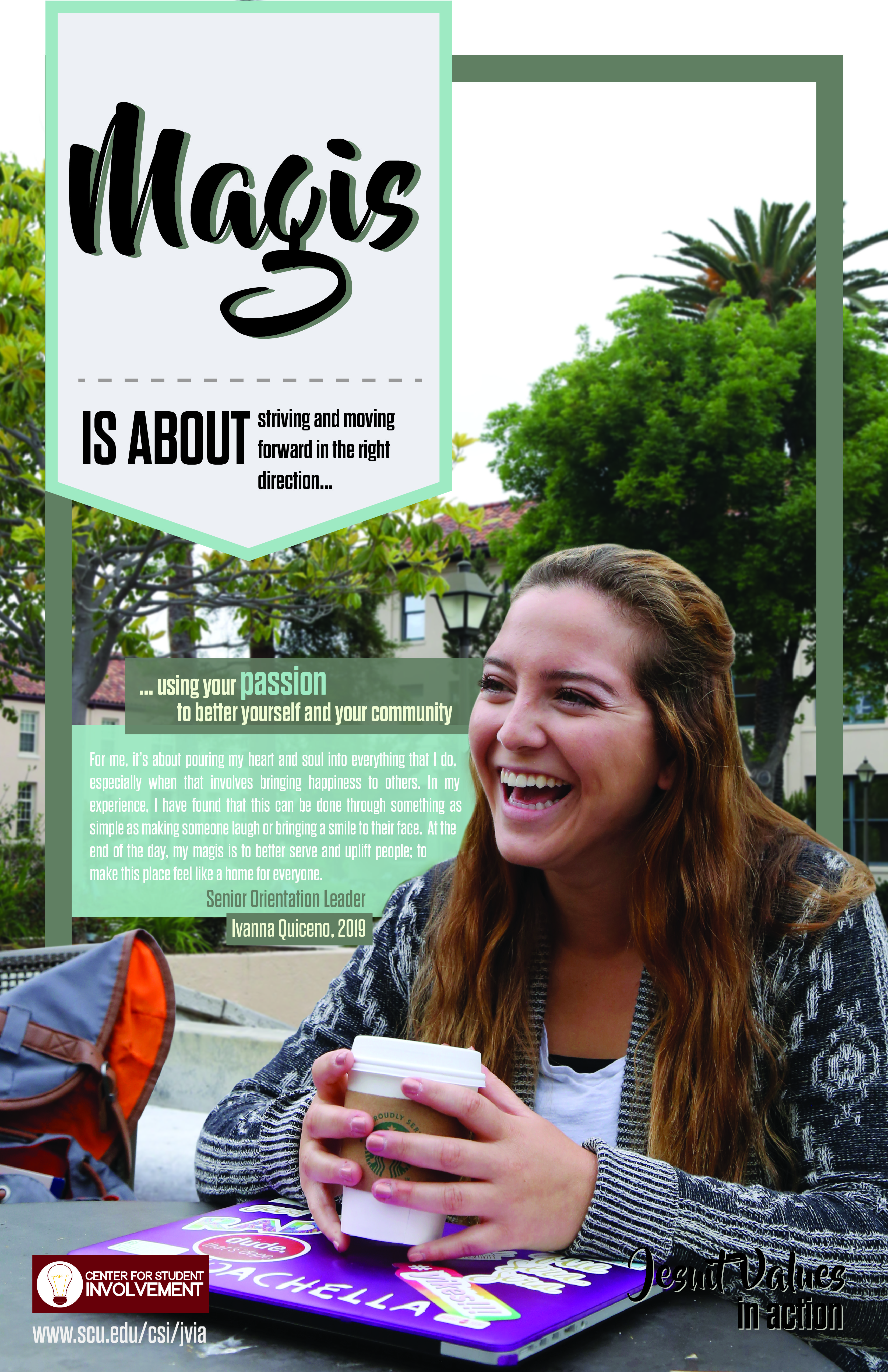 The Jesuit Values In Action project is an opportunity for students to share their own story and experiences and the ways that Jesuit values have guided them. Selected students were nominated by the Center for Student Involvement staff as active leaders who they felt embodied these Jesuit values. Through interviews with CSI, these students were given the space to reflect on impactful experiences at SCU, dive deeper into what the Jesuit values mean, and curate one of these experiences that exemplify a Jesuit value to be shared with the larger SCU community.