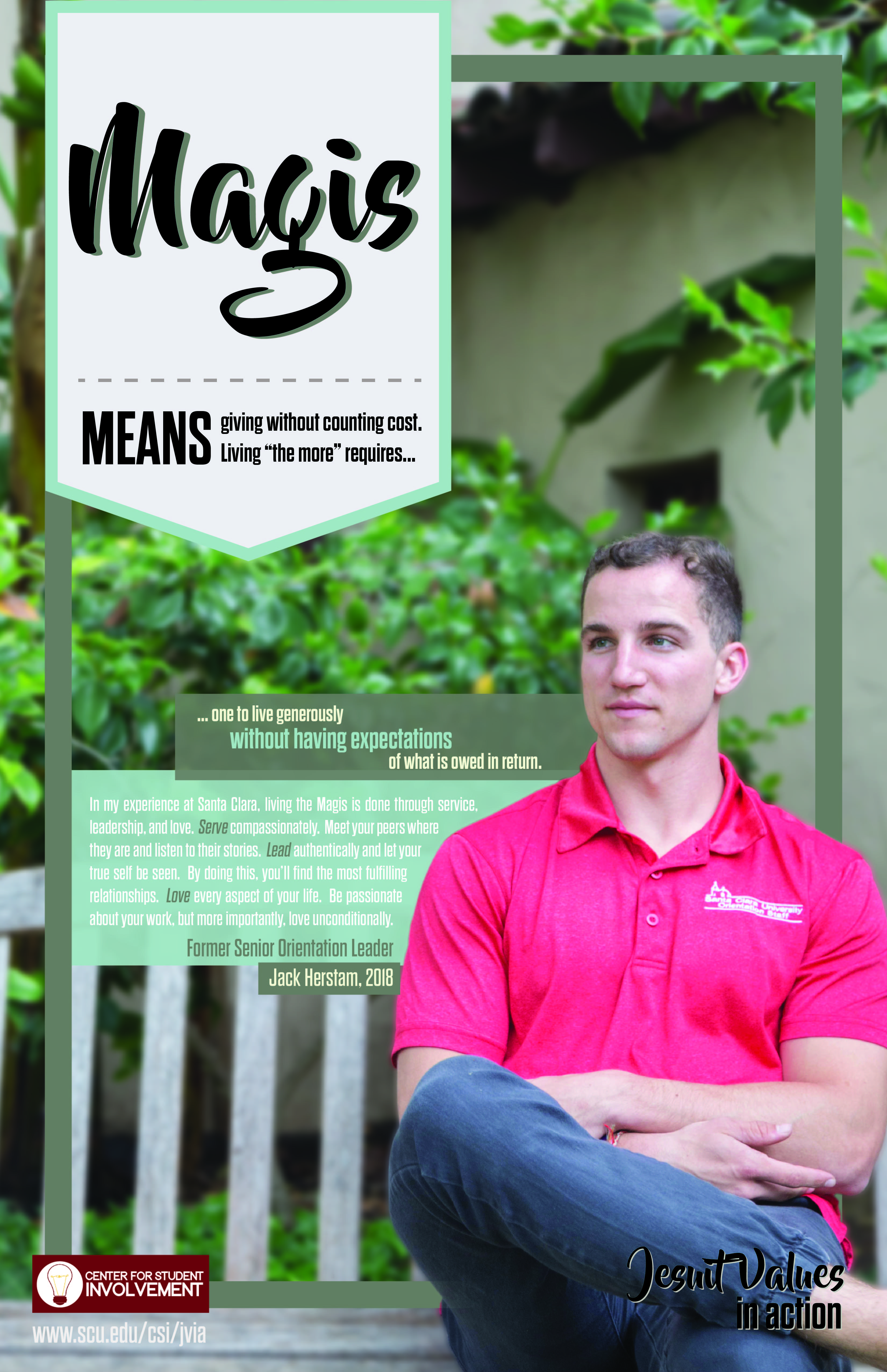 - Magis: Latin meaning the “more,” magis embodies the act of discerning the greater good in a given situation to better glorify or serve God. Magis does NOT mean to always do or give “more” to the point of exhaustion. Magis is the value of striving for the better, striving for excellence.