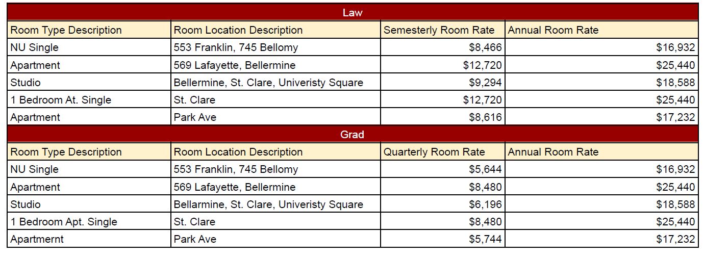 2025-2026 Grad/Law Housing Rates Image